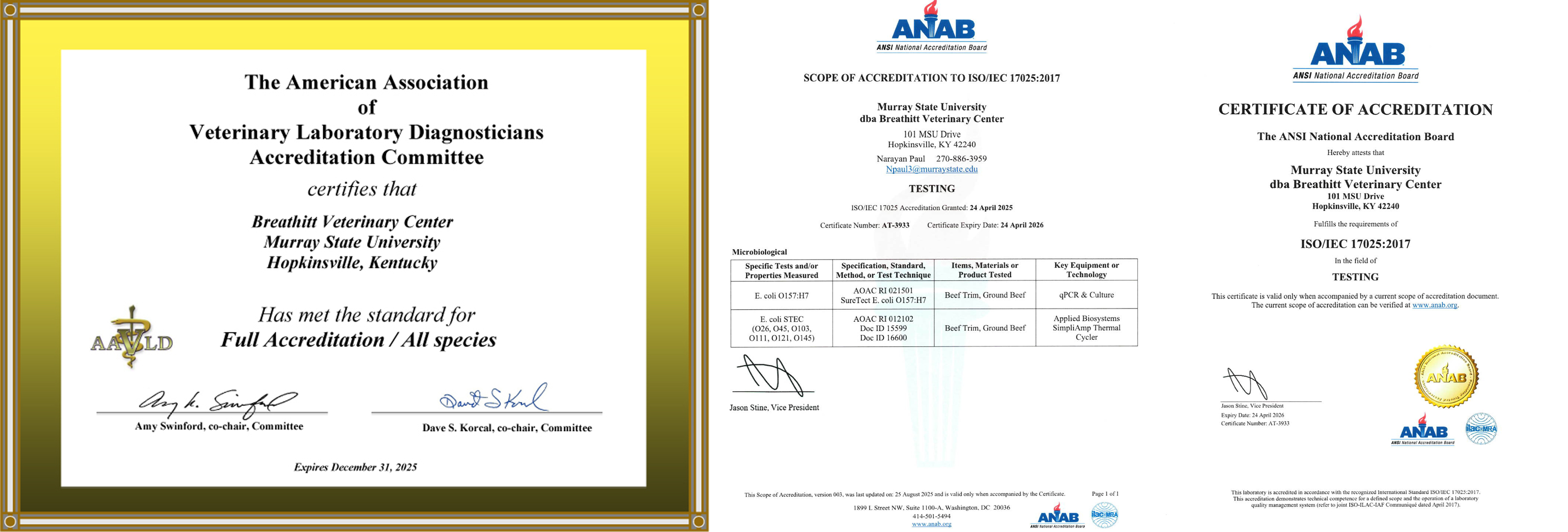 The BVC is fully accredited for all animal species by the American Association of Veterinary Laboratory Diagnosticians (AAVLD). The scientific disciplines of Pathology, Microbiology, Molecular Diagnostics, Toxicology, Serology, and Virology are provided in the facility. The lists on the following pages include most of the diagnostic procedures performed by the BVC. The BVC continually expands its testing capabilities and strives to incorporate advancements in scientific tests and equipment into its operations. Please contact the BVC if you have any questions regarding the availability of tests or with a recommendation for additions.